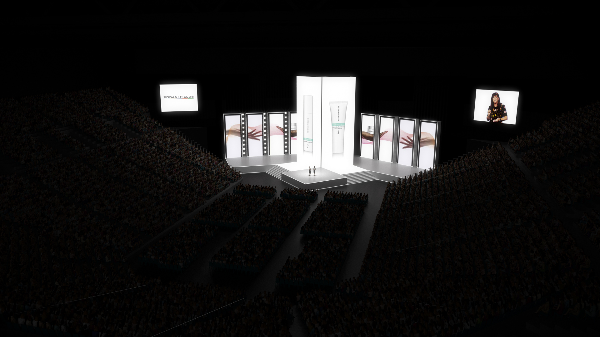 Stage design for R+F’s annual Las Vegas event at the MGM Grand Garden Arena based on event marketing firm George P. Johnson’s Es Devlin inspired brief. Added a crowd constituting half a billion polygons for visualization.